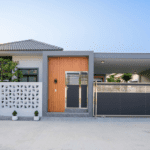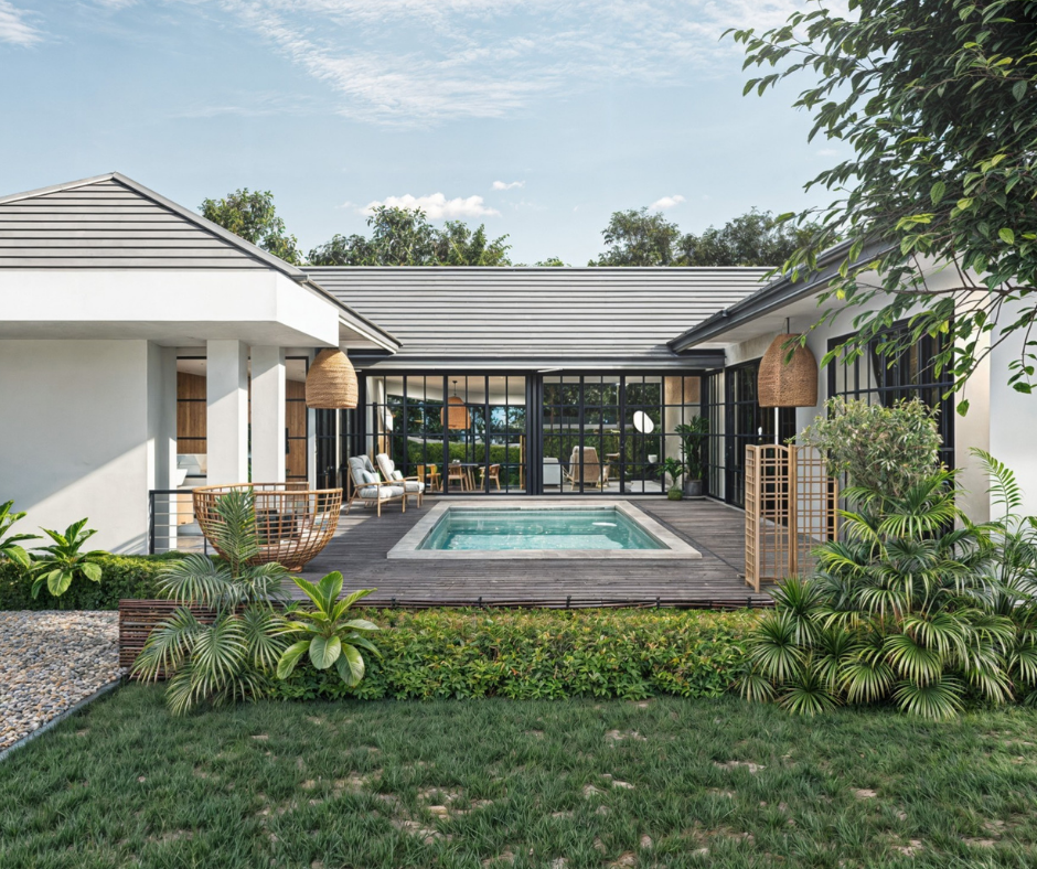 In Hua Hin Soi 88, there are several interesting projects because it is an area where many people are looking to have vacation homes in Hua Hin. Today, I have a special project with unique and interesting house designs being built in Soi 88. This project is called “Bussarin Residence” and will consist of only 4 houses. With this uniqueness, both the developer and the buyers can customize the houses to fit their lifestyles. From this 3D rendering, you can see that the houses have an open layout with a swimming pool in the center, giving them a modern and bright look. The model house is currently under construction and is expected to be completed by mid-year. If anyone is interested, we can schedule a visit to see the location and discuss furthermore.