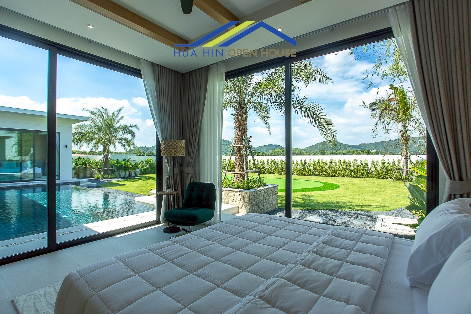 This exclusive pool villa for sale in Hua Hin near Black Mountain Golf Course is designed to have your very own private putting green right in the backyard, just steps away from an elegant infinity saltwater pool.